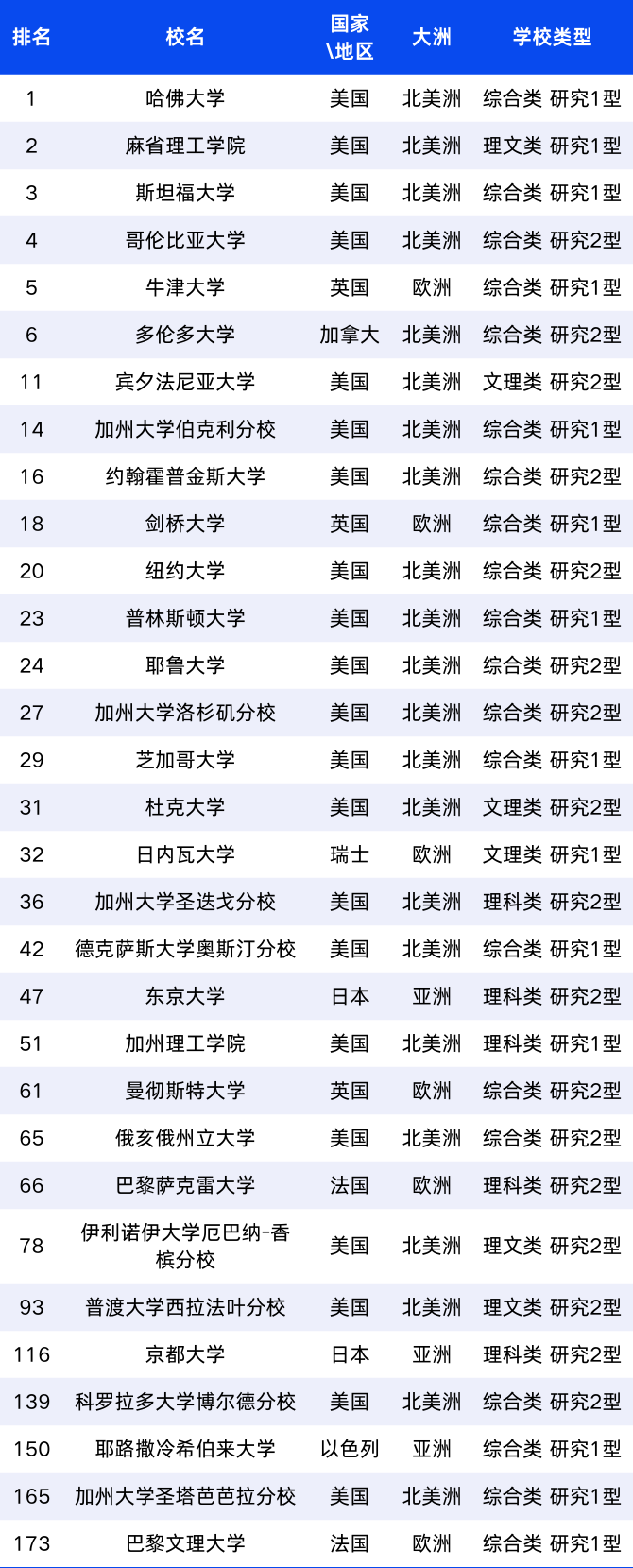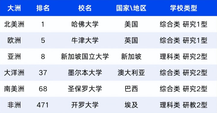 哈佛大学全球第1名,北美洲第一。牛津大学全球第5名,欧洲第一;新加坡国立大学全球第8名,亚洲第一;墨尔本大学(澳大利亚)全球第37名,大洋洲第一;圣保罗大学(巴西)全球第68名,南美洲第一;开罗大学(埃及)全球第471名,非洲第一。