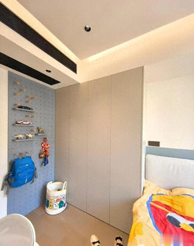 比如,整面蓝色洞洞板挂在衣柜旁,利用色彩和空间展示孩子的收藏款,比如毛绒玩具、小汽车和书包,不但美观而且方便取用。
